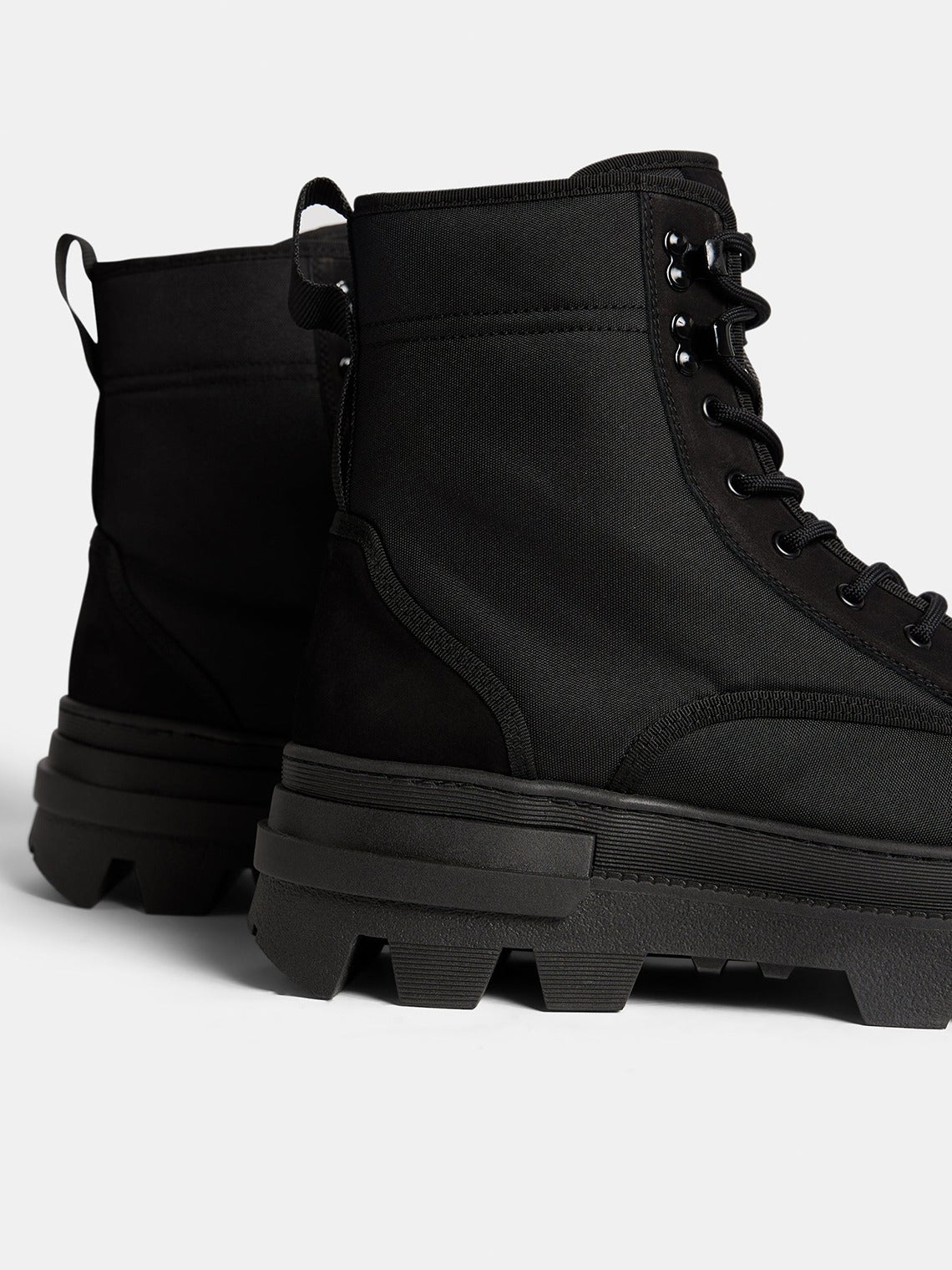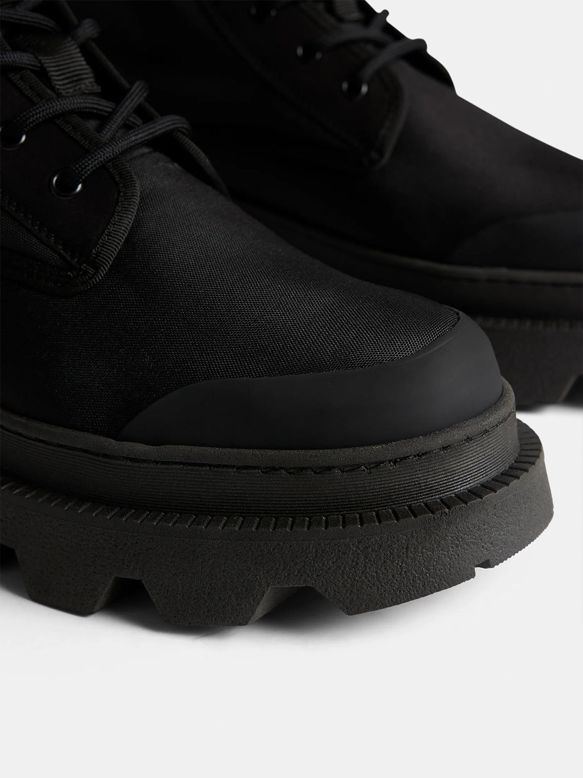 Lightweight, water-repellent Afla Tech Ankle Boots, taking on the traditional hiking style with elevated details. Crafted from durable nylon canvas and a chunky rubber sole for ultimate traction and constructed with thoughtful details like a nubuck heel panel, webbing pullers, and a branded nubuck patch on the tongue. Made in Portugal.
