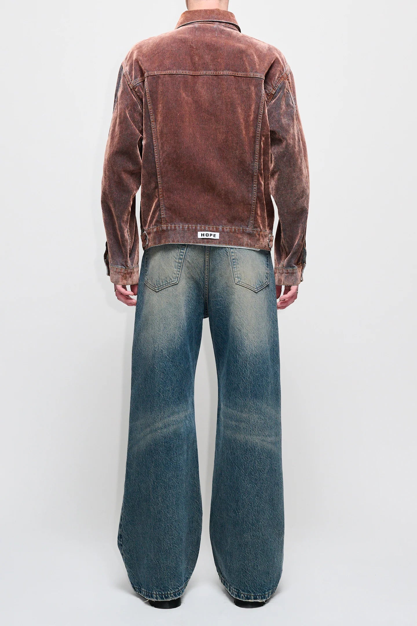 Bold Denim Jacket features an oversized, boxy fit and is crafted from a vintage blue wash with a dark green dirty tint. It includes four front pockets, branded metal buttons, and bound seams.