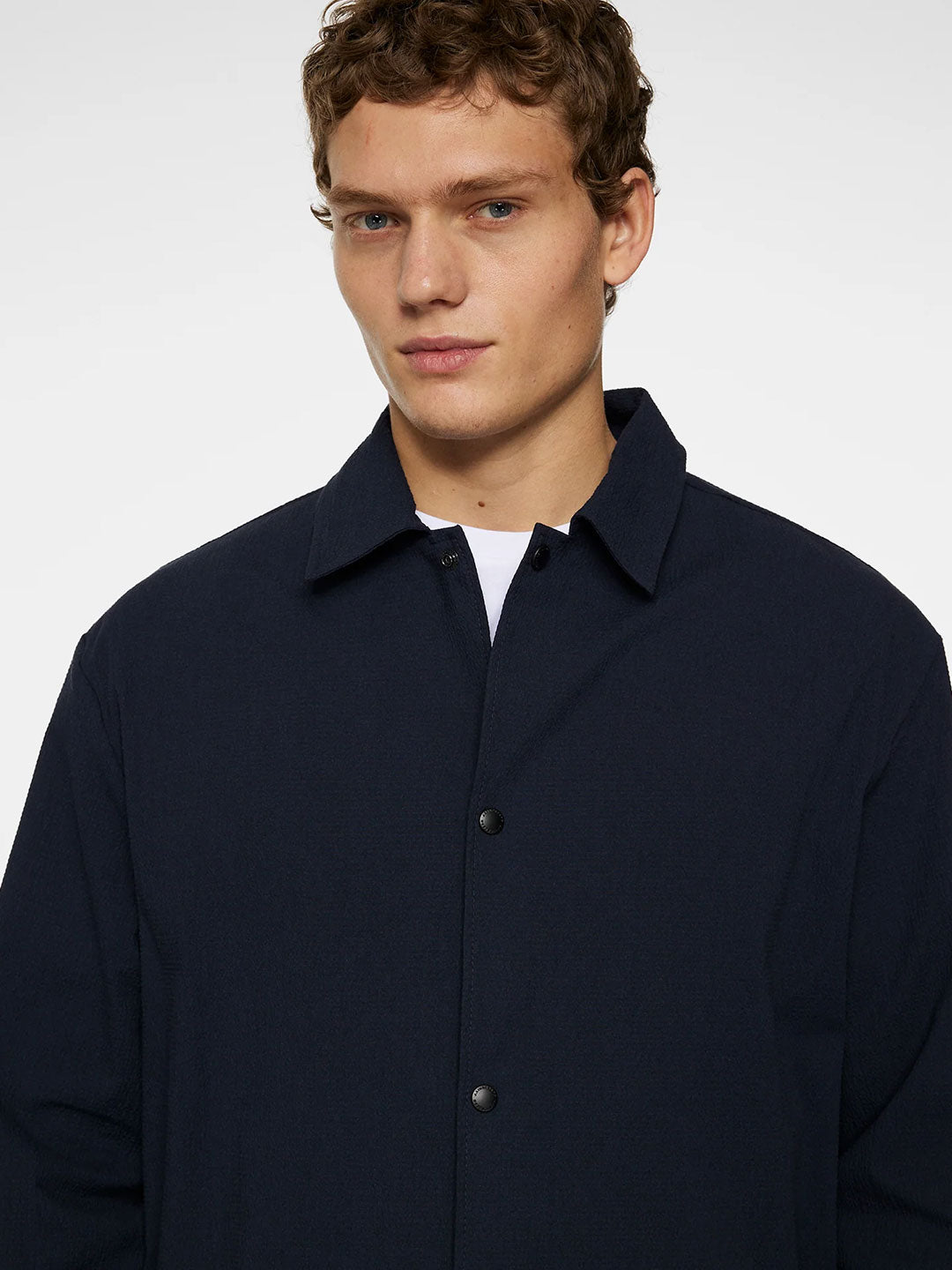 Celian Seersucker Overshirt is cut in a relaxed fit. Features branded press buttons and convenient seam pockets for modern functionality.