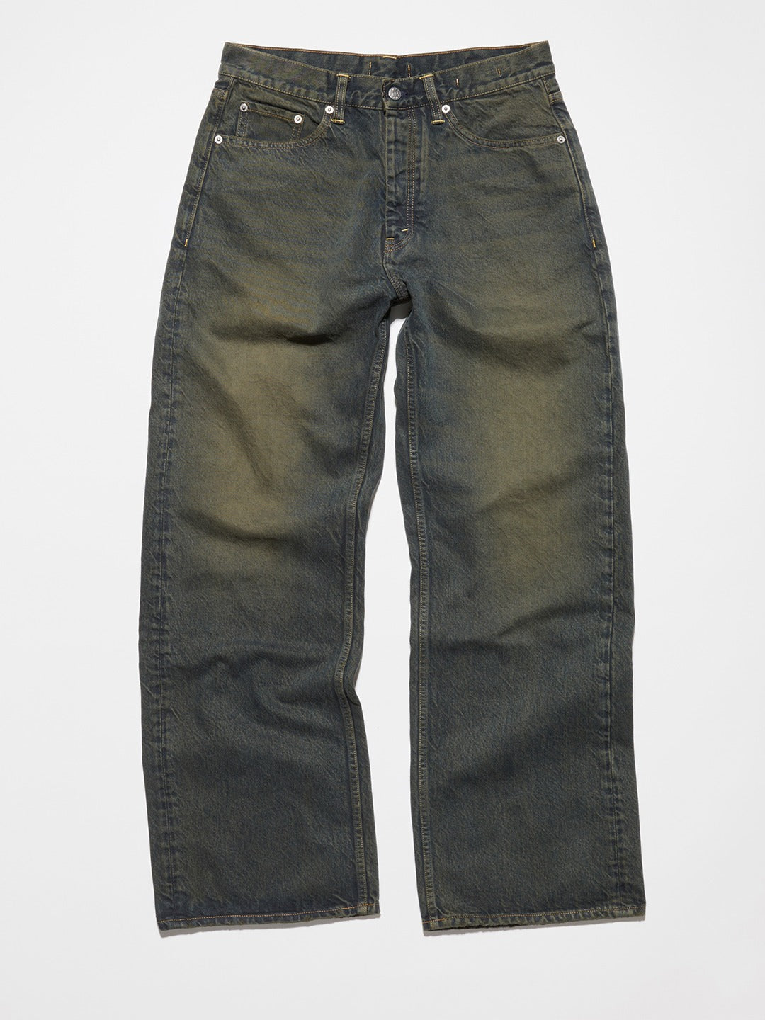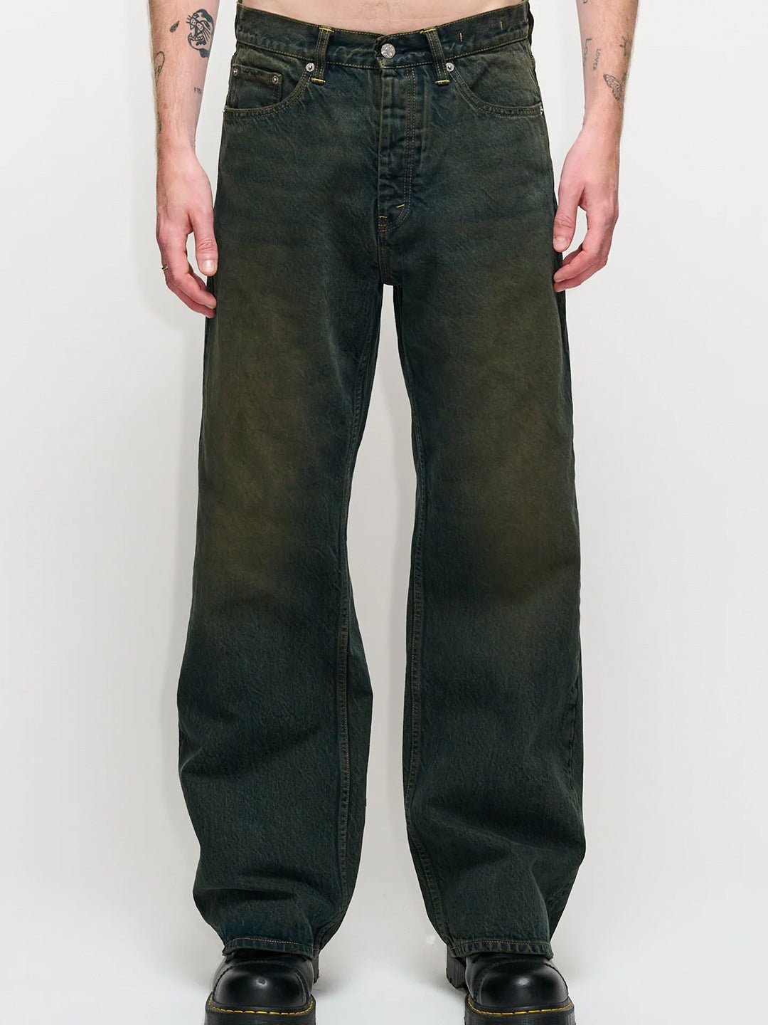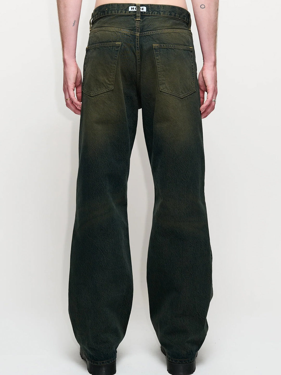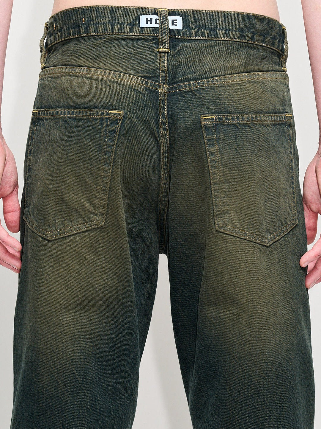 Criss Jeans in dark green dirty tint are a relaxed five-pocket style cut from a rigid 100% certified organic cotton. These 5-pockets jeans have a wide leg silhouette with a dropped crotch and loose fit. Details include HOPE branded denim buttons and trims. HOPE denim washes are achieved with advanced techniques that drastically reduce the amount of energy, chemicals, and water used.