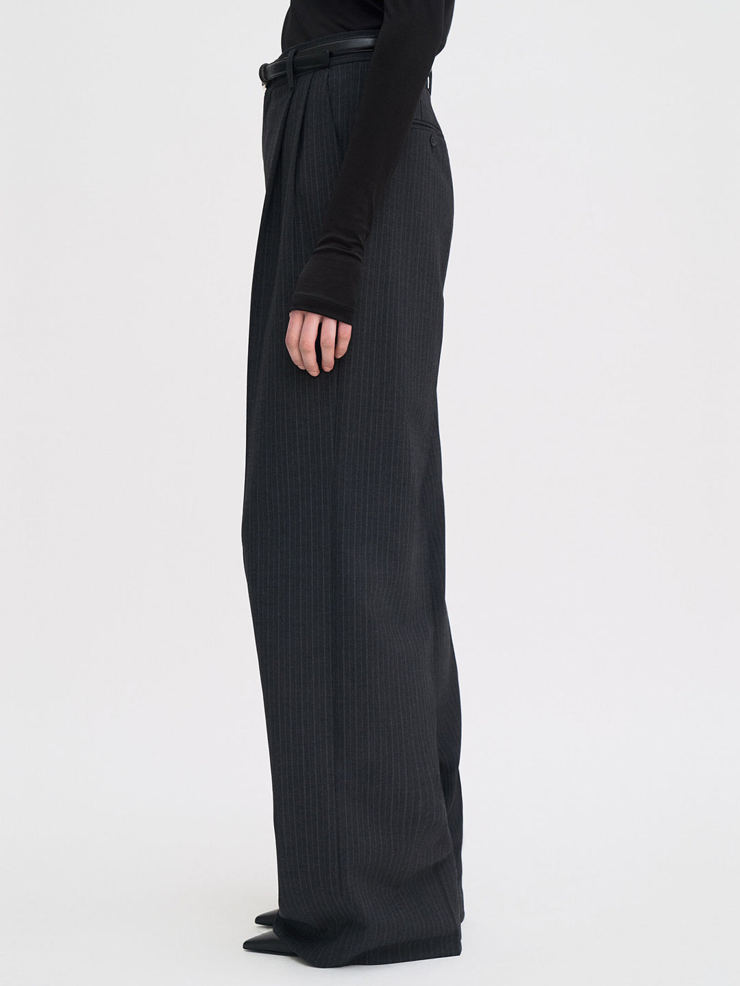 The Darcey Pinstripe Trousers in black are designed with a high fitted waist, voluminous pleats, and a generous wide leg shape with an extra long length. Tailored from a mid-weight stretch wool blend with a textured pinstripe pattern. Wear with the Davina Pinstripe Blazer for a full suit look.