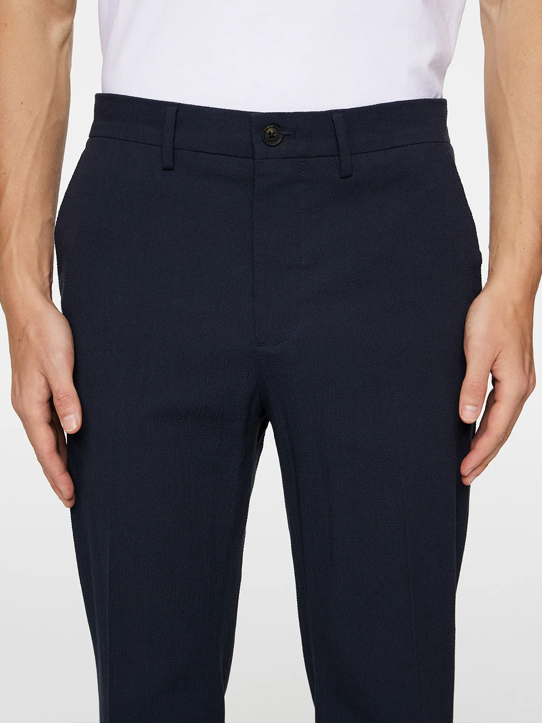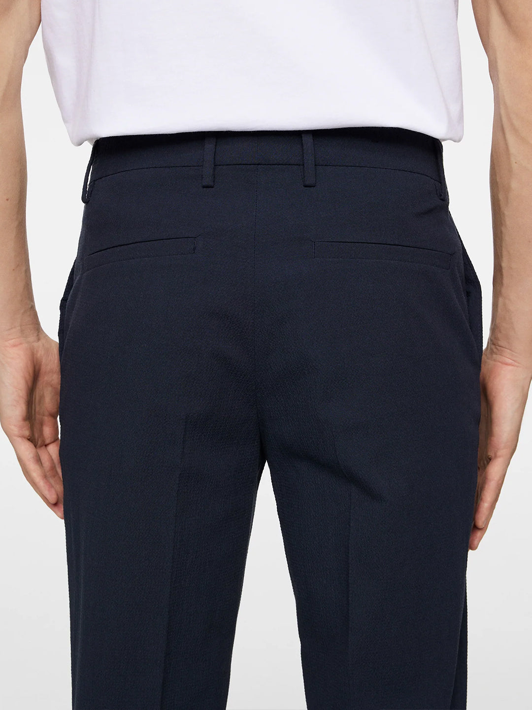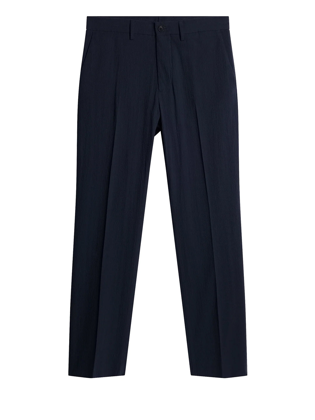 These tailored seersucker Dropper Pants offer a streamlined look with creased legs, branded buttons, and an adjustable hem.