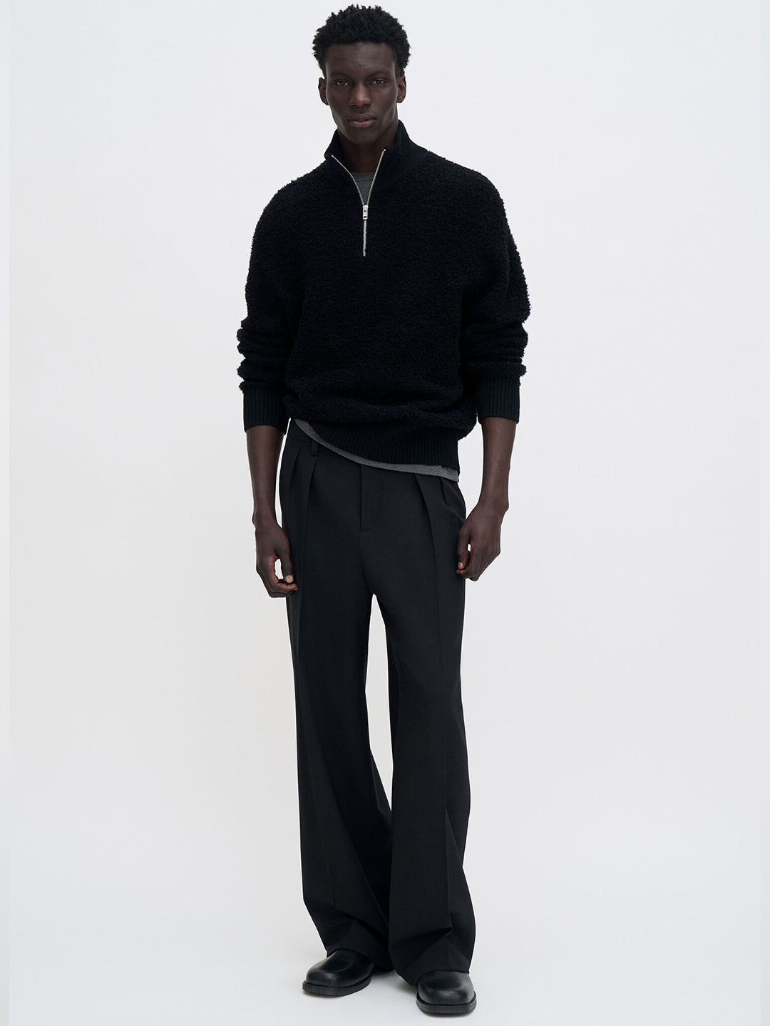 Relaxed fit half zip sweater with contrast yarn detailing. Knit from a chunky, heavyweight certified wool blend with a fluffy ribbed texture.