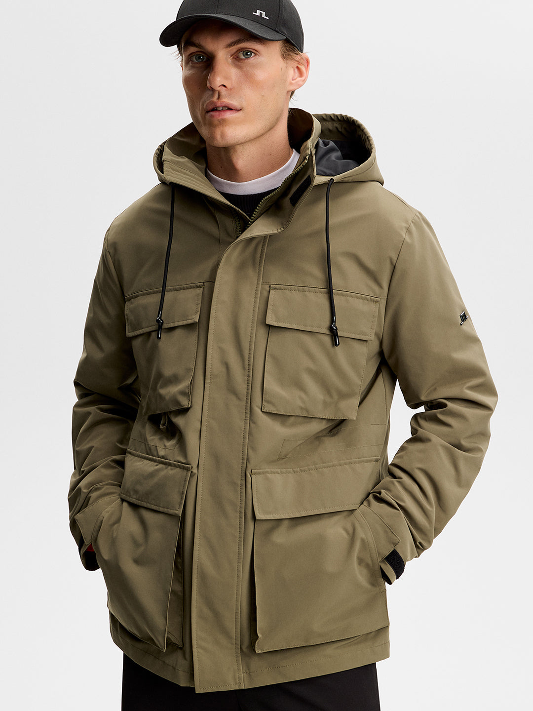 Lightweight jacket with multiple front pockets, a stand collar and concealed fastening.