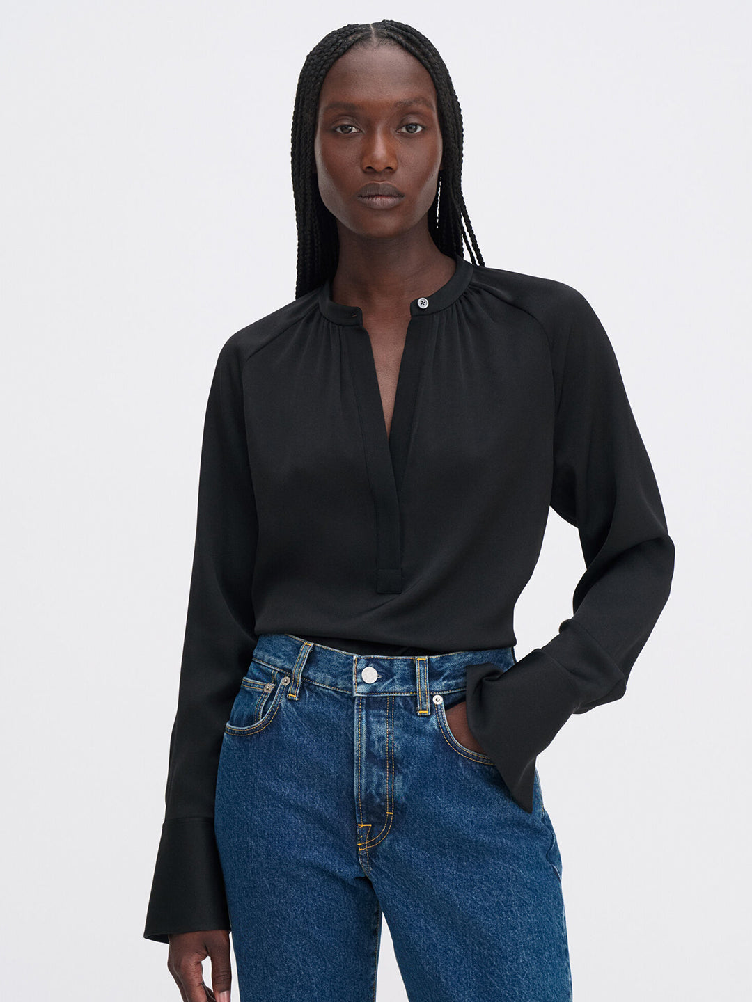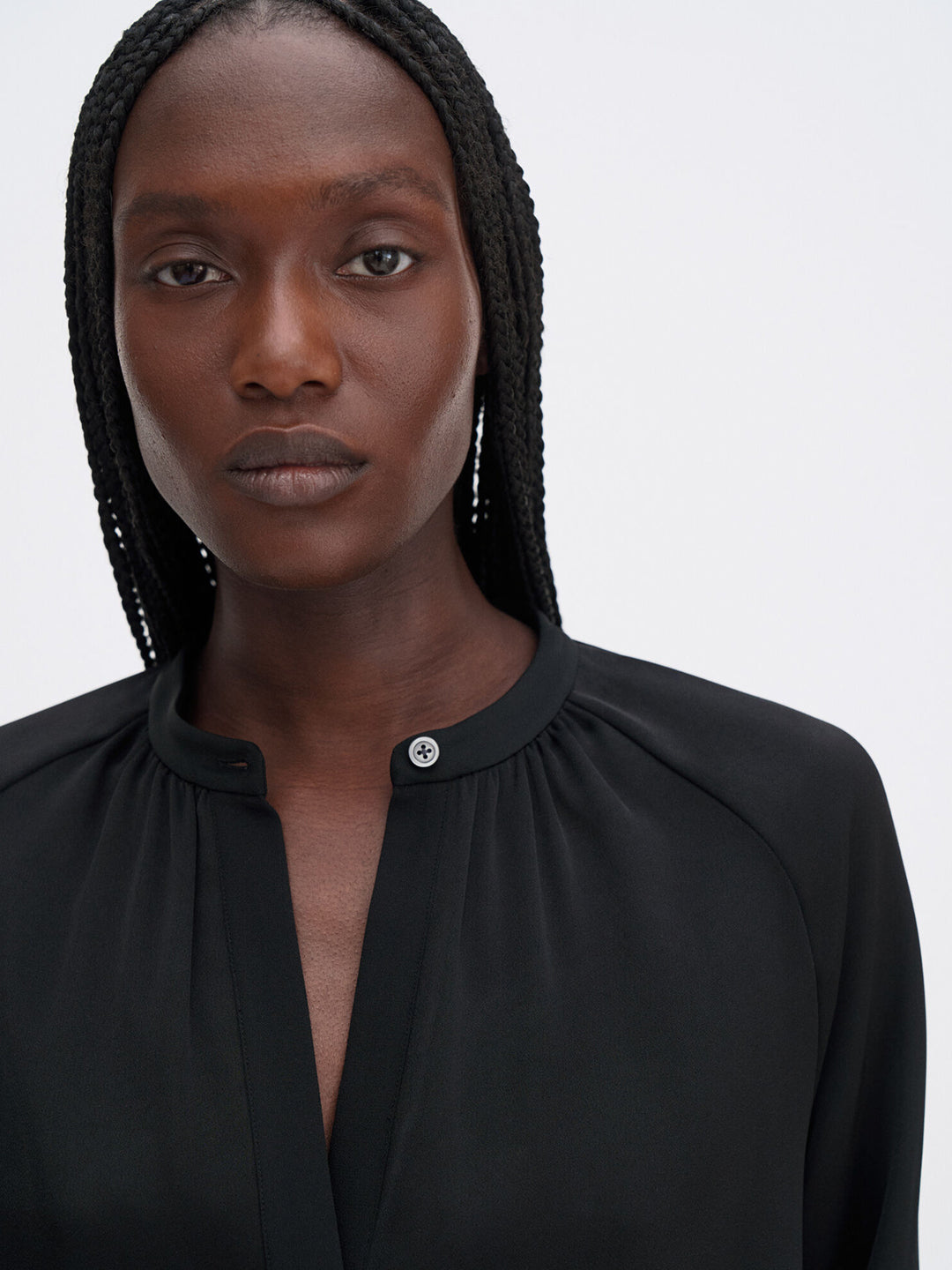 Relaxed fit blouse with a raglan sleeve and gatherings at the stand collar neckline.