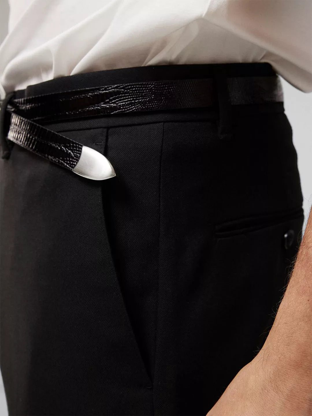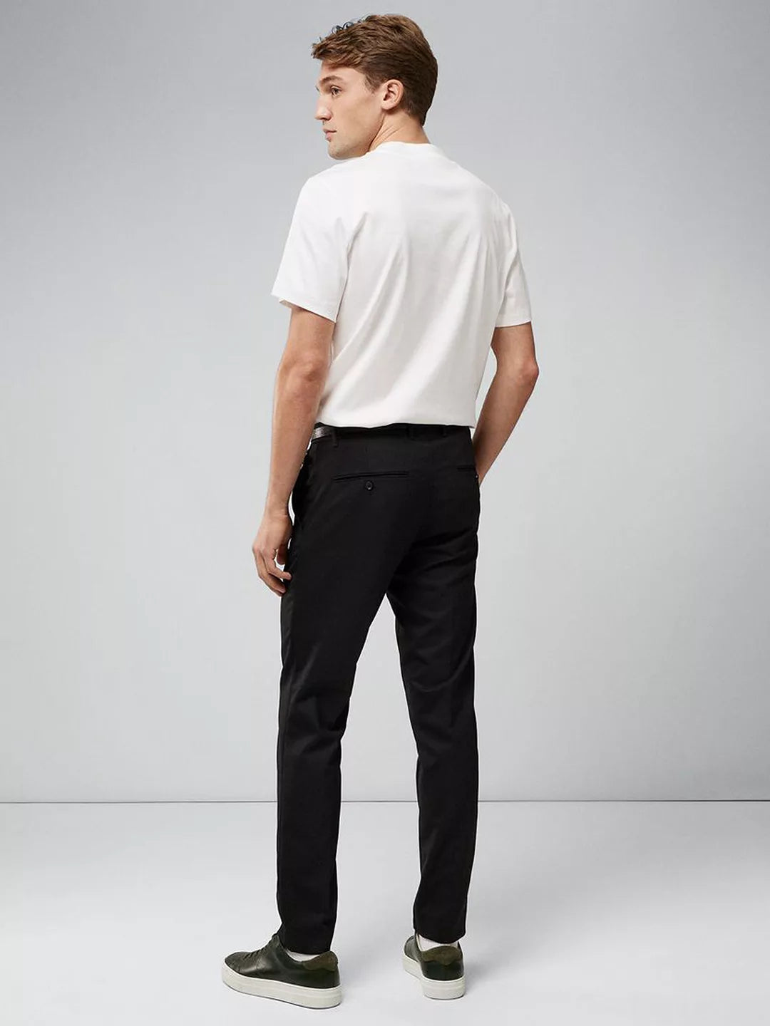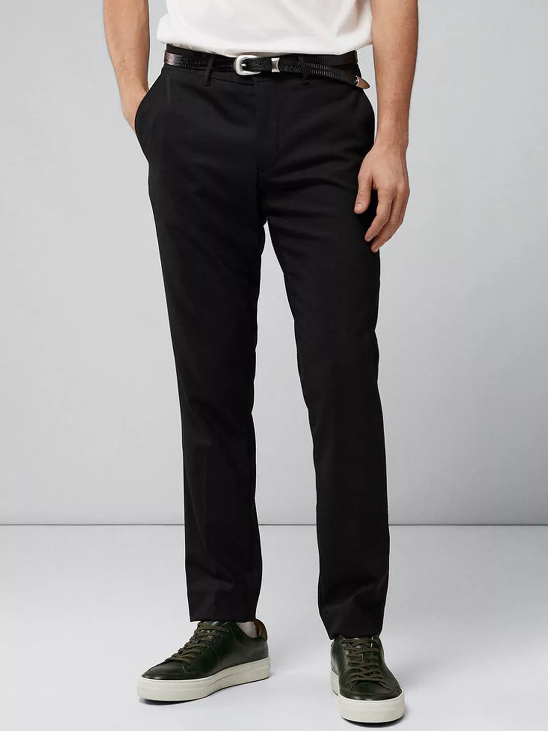 Slim fit trousers made from stretch fabric. Tailored press folds. Slanted side pockets. Single back welt pocket.