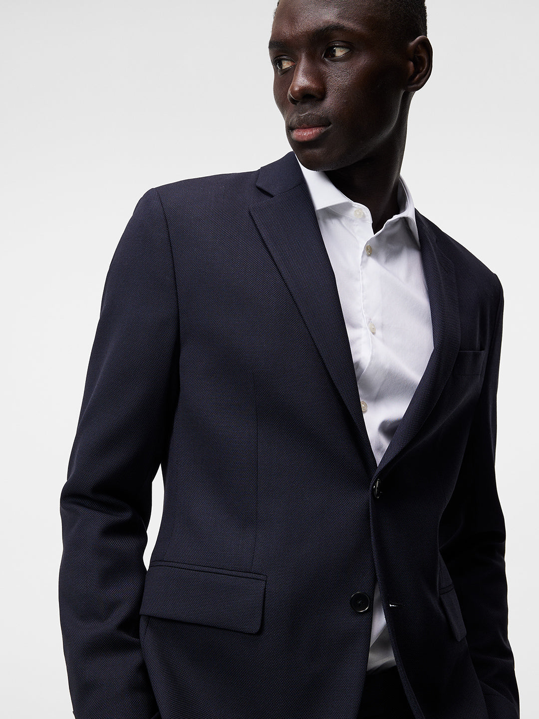 Hopper U Active Blazer is a slim fit and has been crafted in a blend of soft wool and recycled fibres. This style is breathable and crease-resistant. Notched lapel, button-up front with Corozo branded buttons, 2 jetted front pockets with flap. Welt pocket at chest, double-vented at back. Branded half lining, hanger loop at neck.