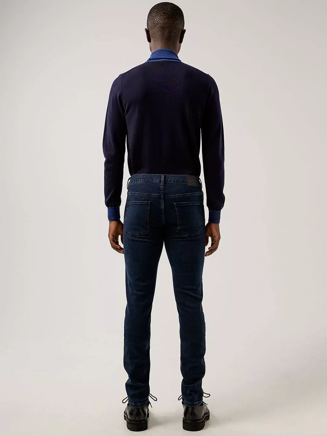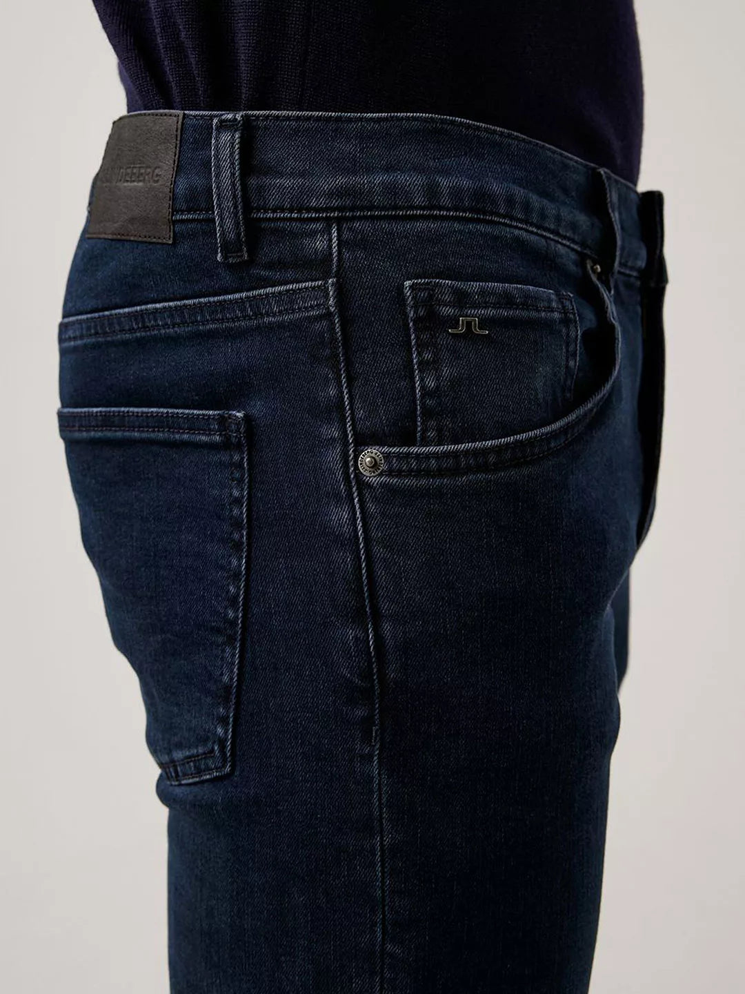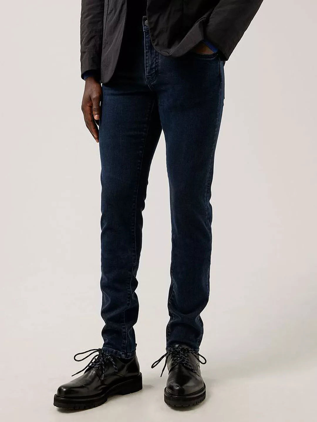 Slim fit style in a blue/black wash. Stretch denim and antique silver buttons and rivets. Zip fastening concealed by a placket. Logo rivet at coin pocket. Jacron logo patch at back.