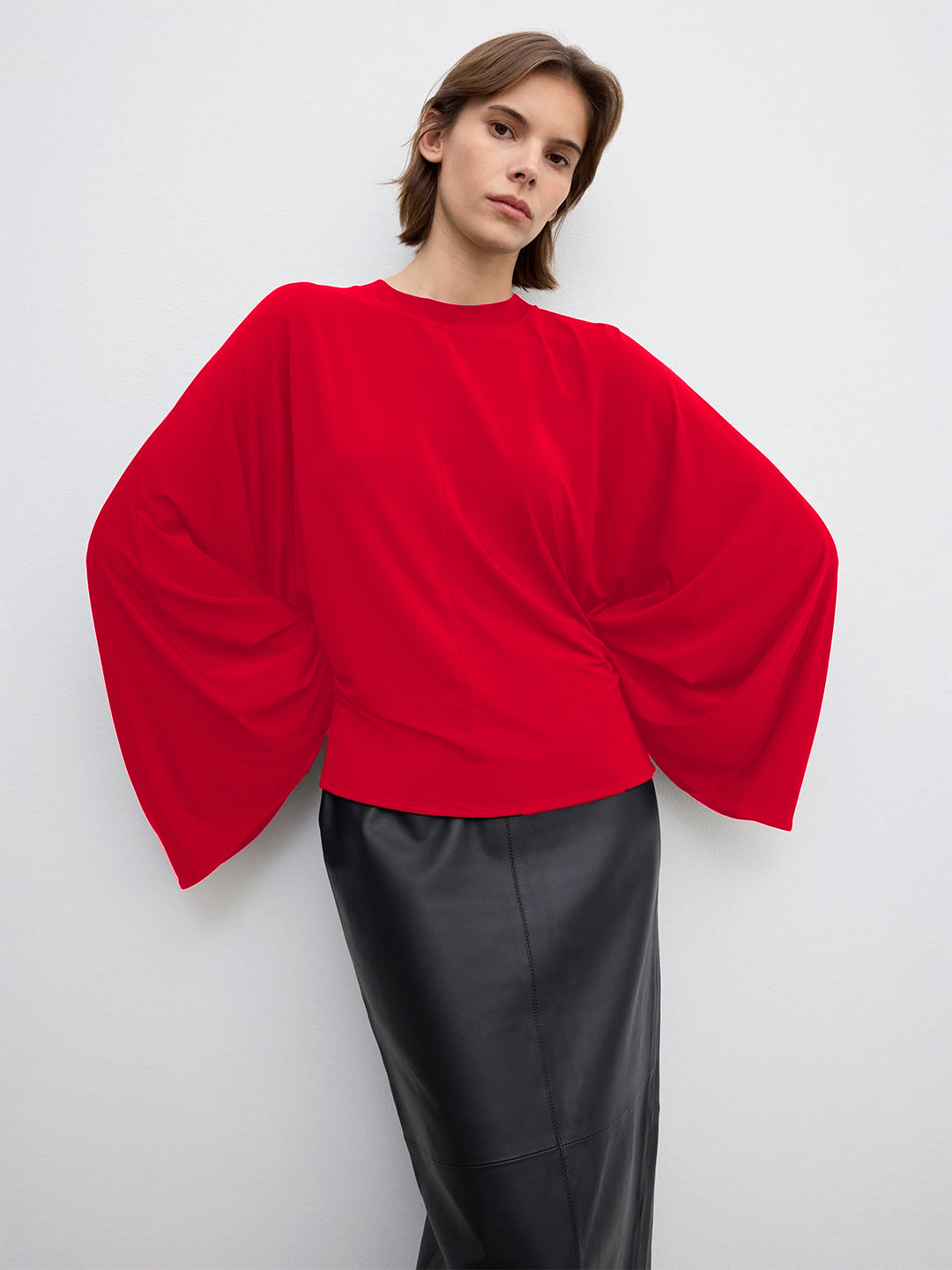 Crew-neck top with exaggerated, elbow-length kimono sleeves and tonal topstitching centre front and back.