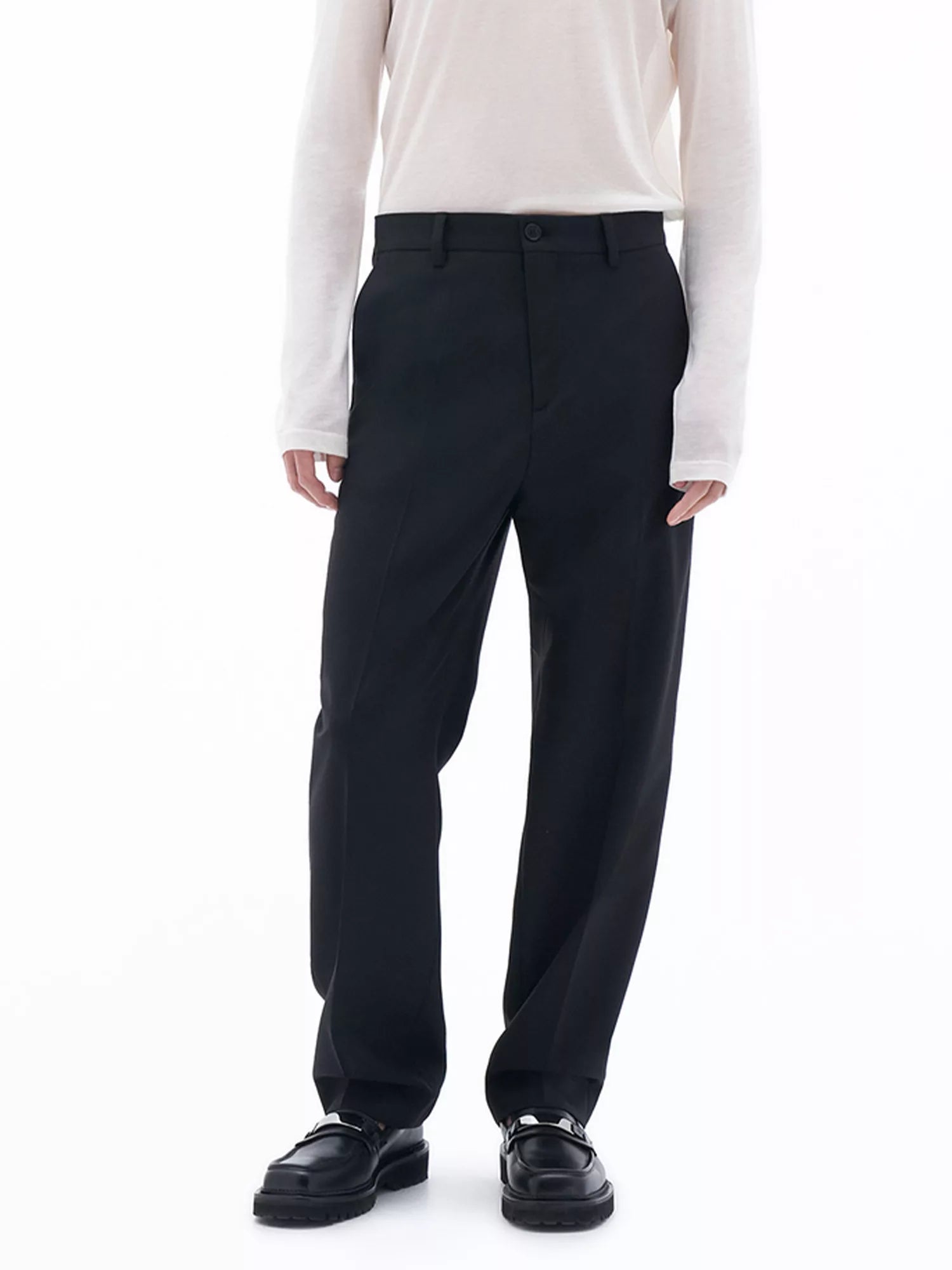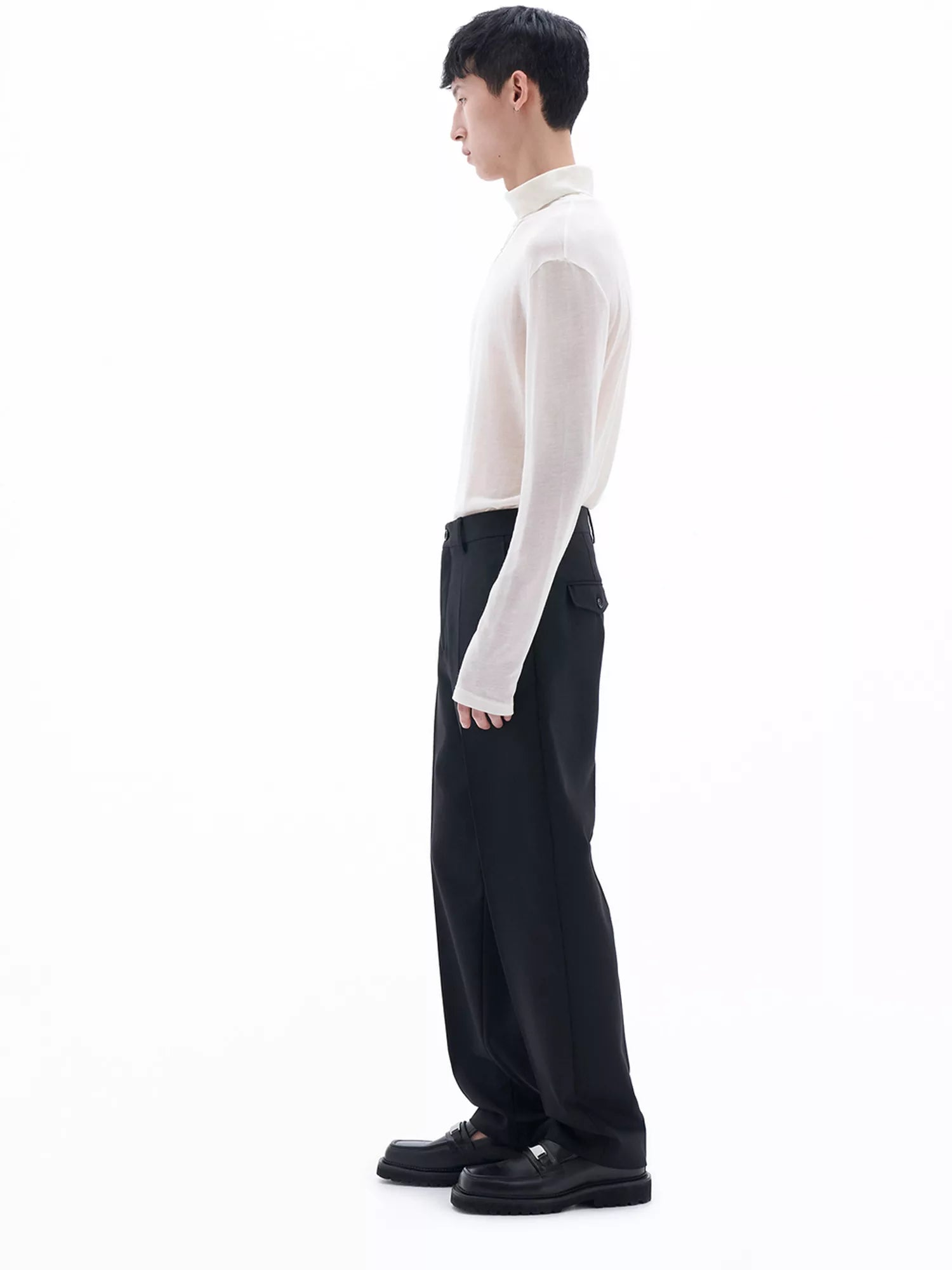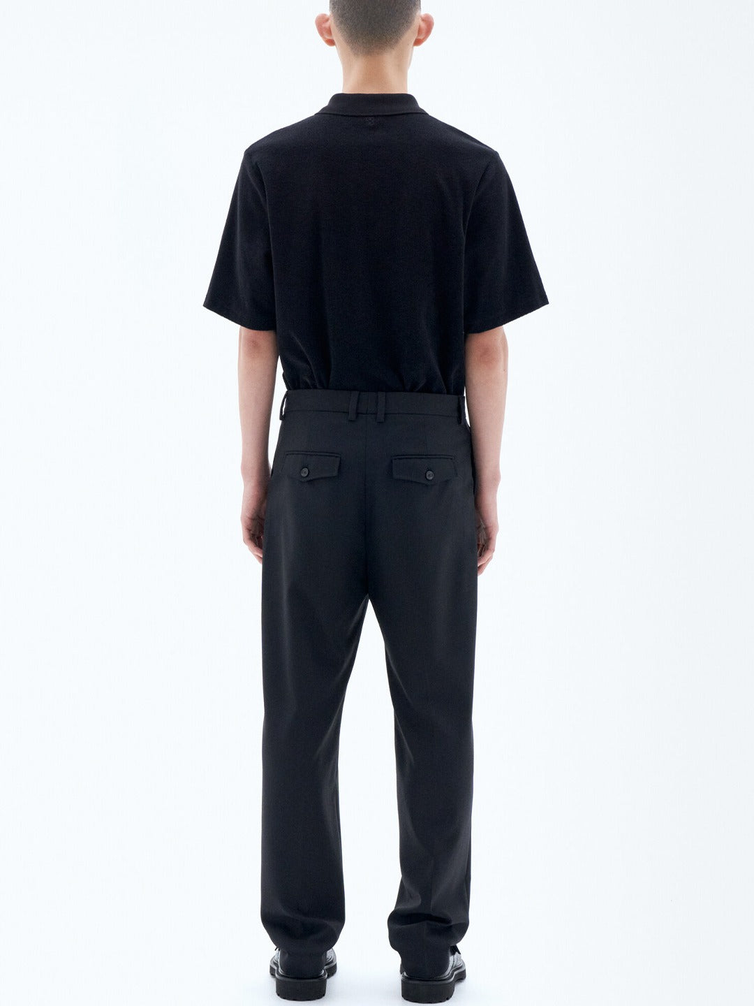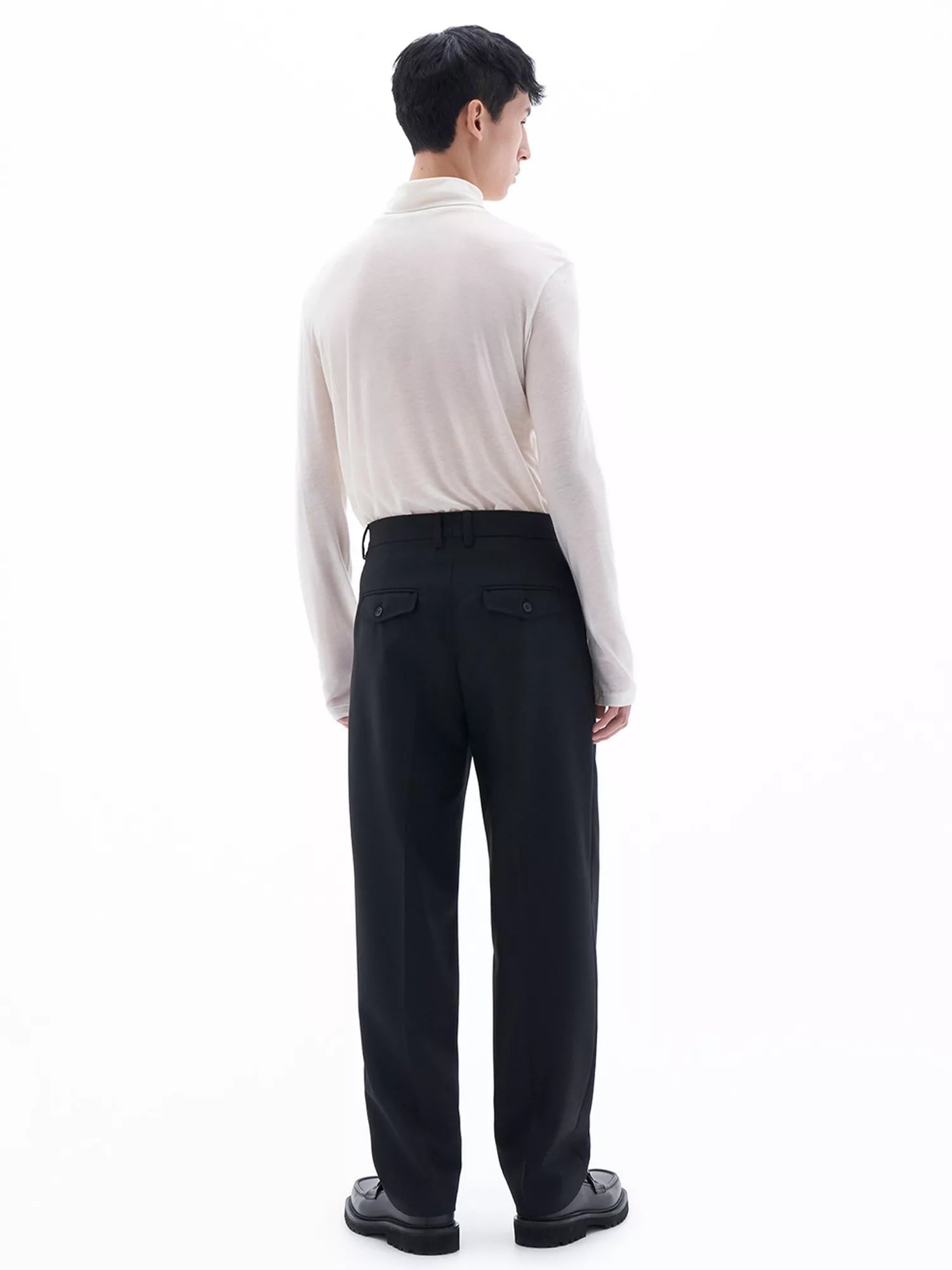 Relaxed non-stretch wool trousers. Tapered shape. Horn button and zip closure. Slash pockets at front. Welt pockets at back. Woven in Turkey