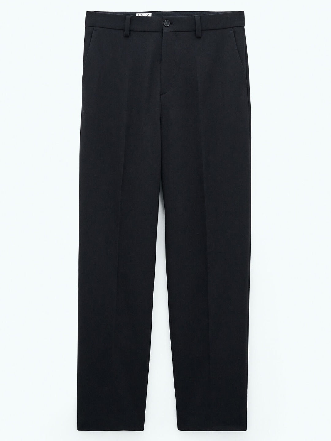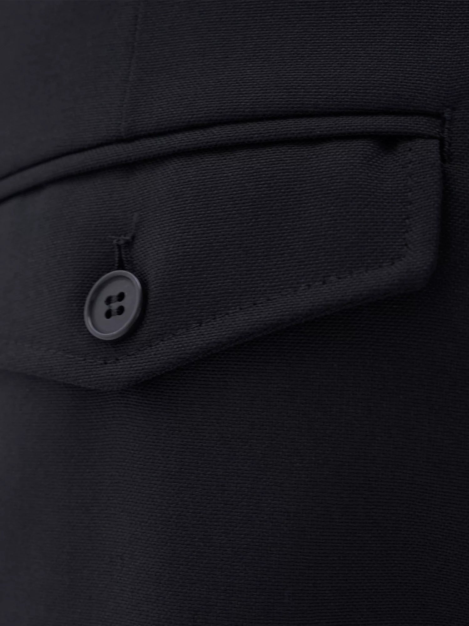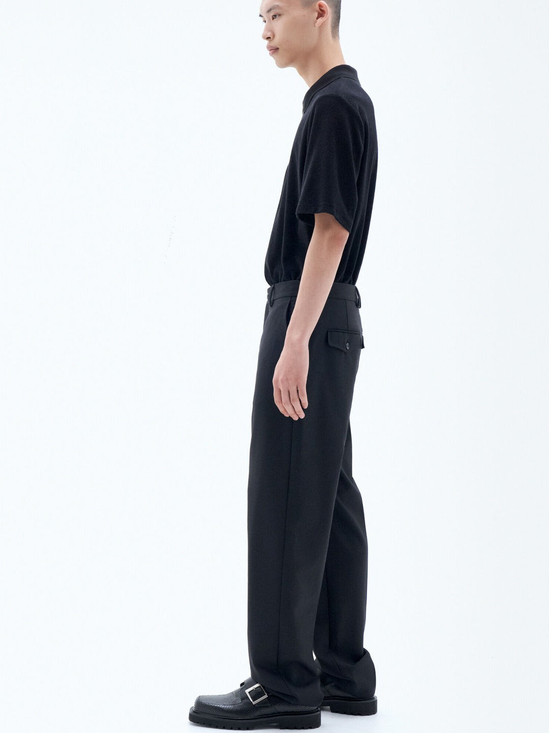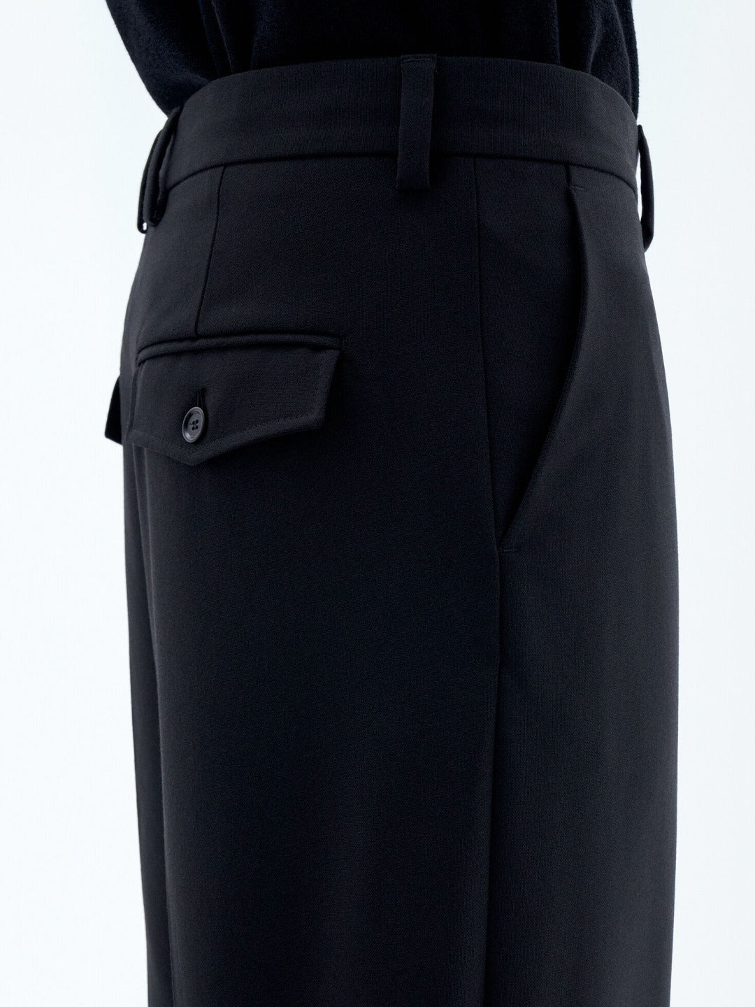 Relaxed non-stretch wool trousers. Tapered shape. Horn button and zip closure. Slash pockets at front. Welt pockets at back. Woven in Turkey