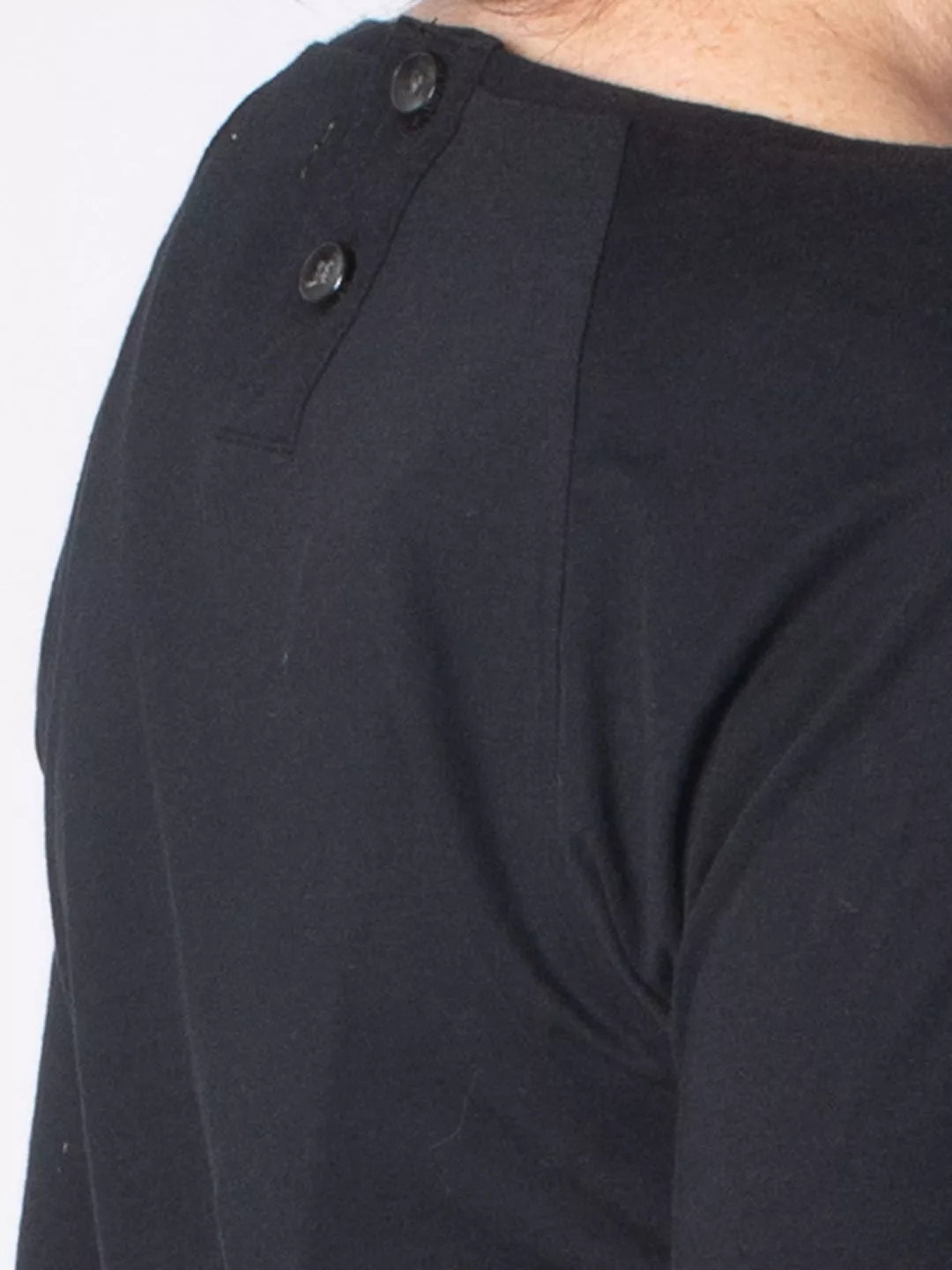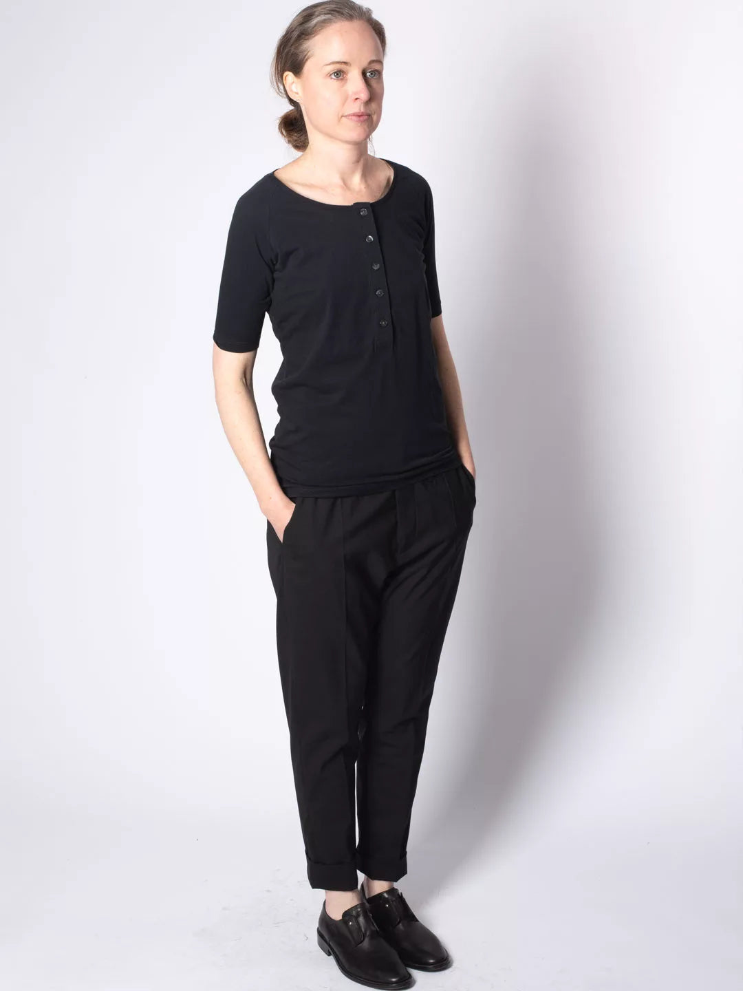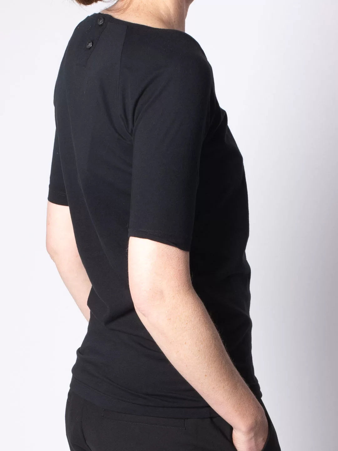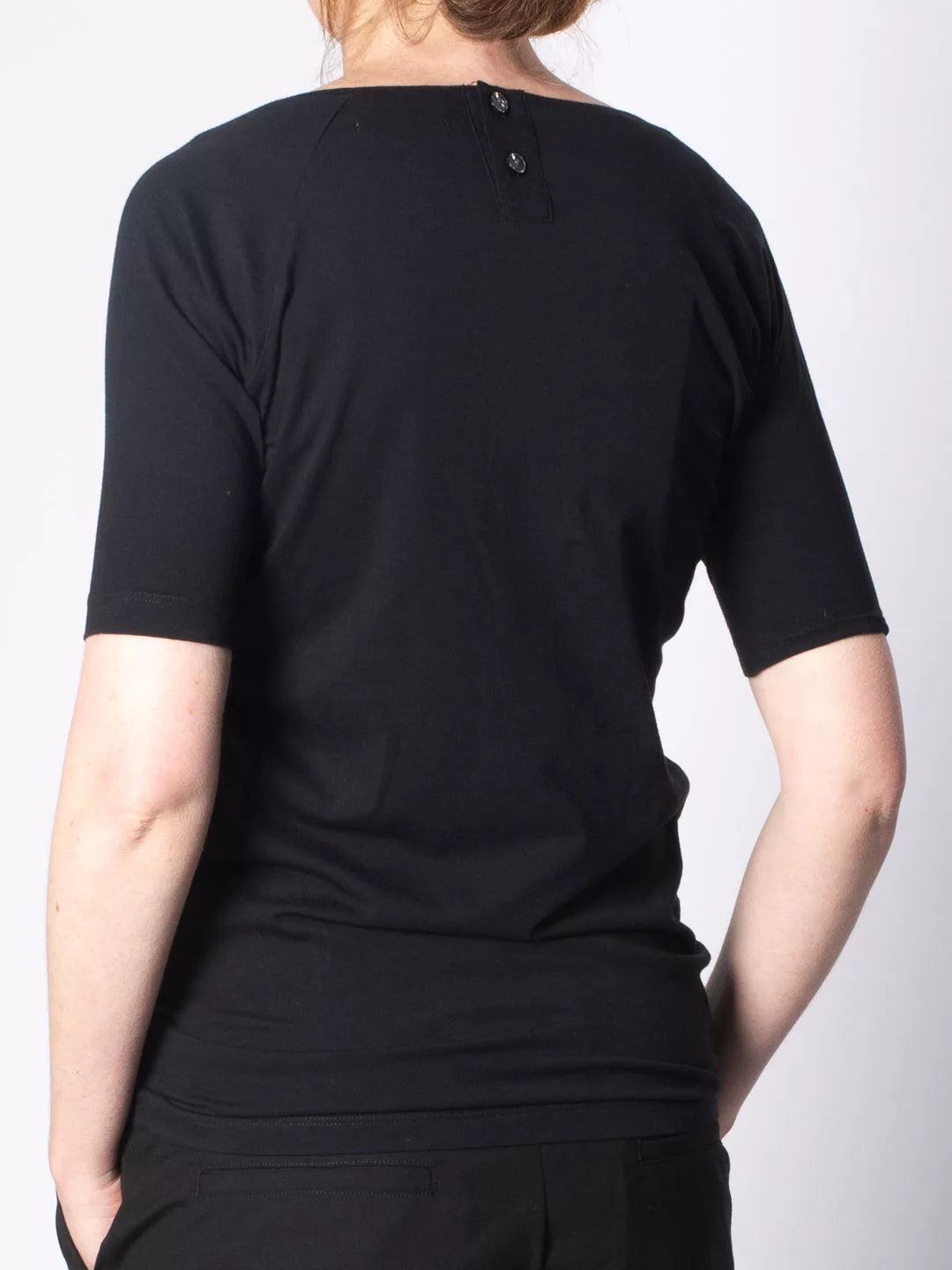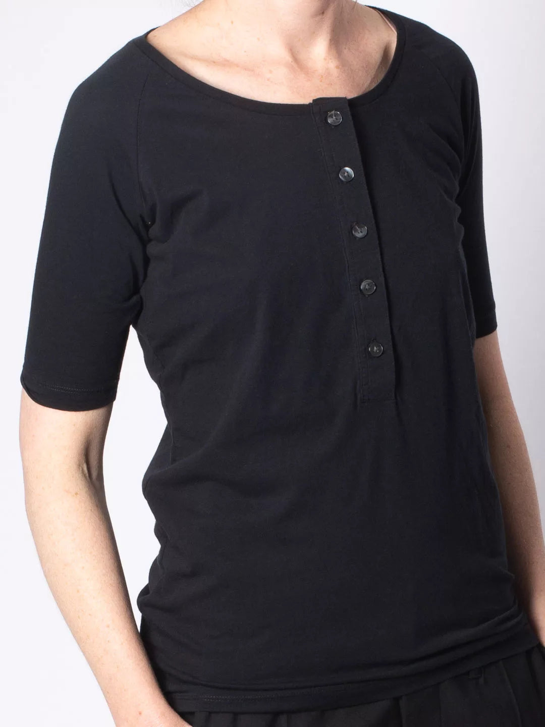 Baseball style t shirt with slightly longer short sleeves with raglan detail. Low round neckline with buttons front and back.
