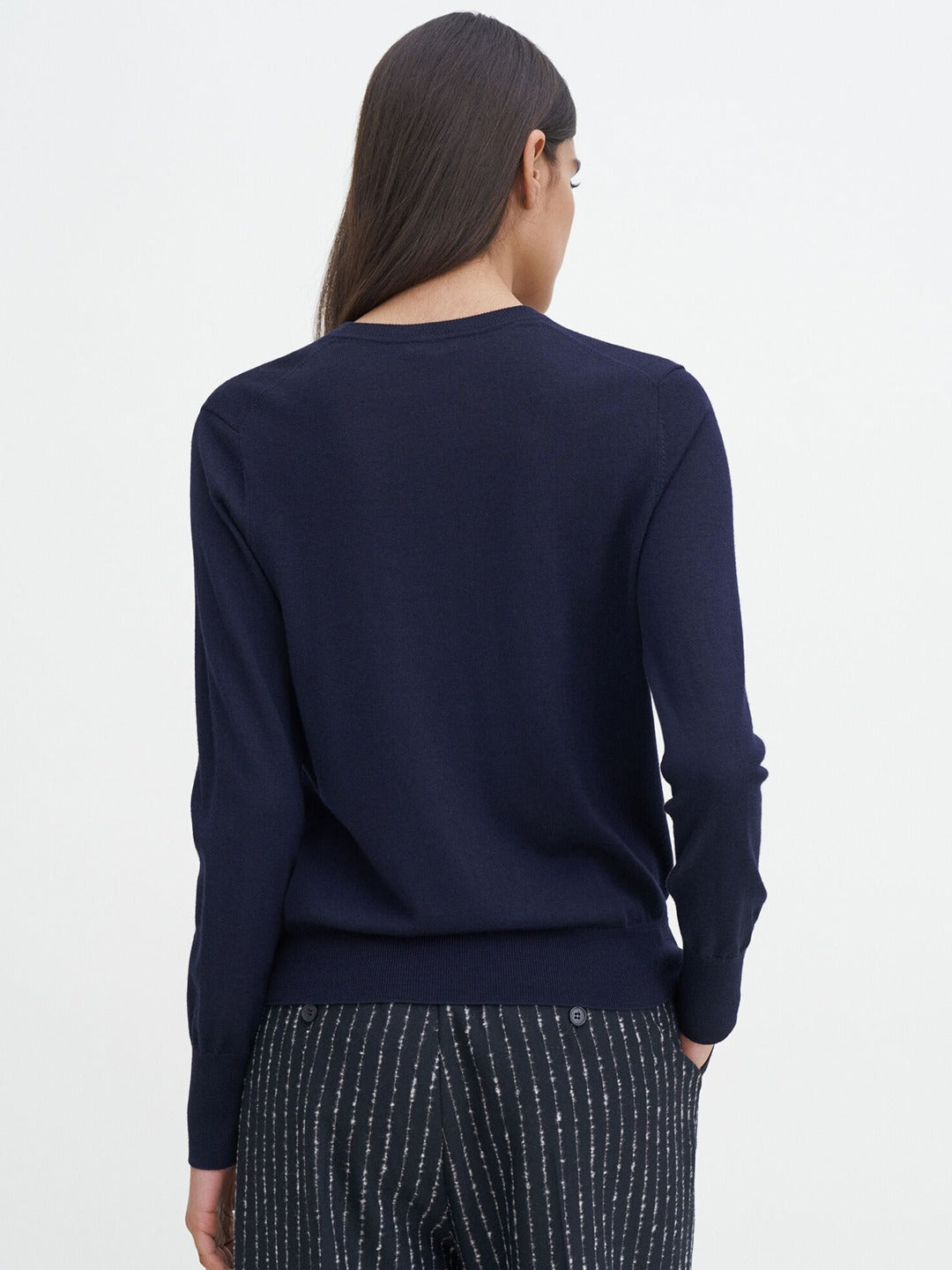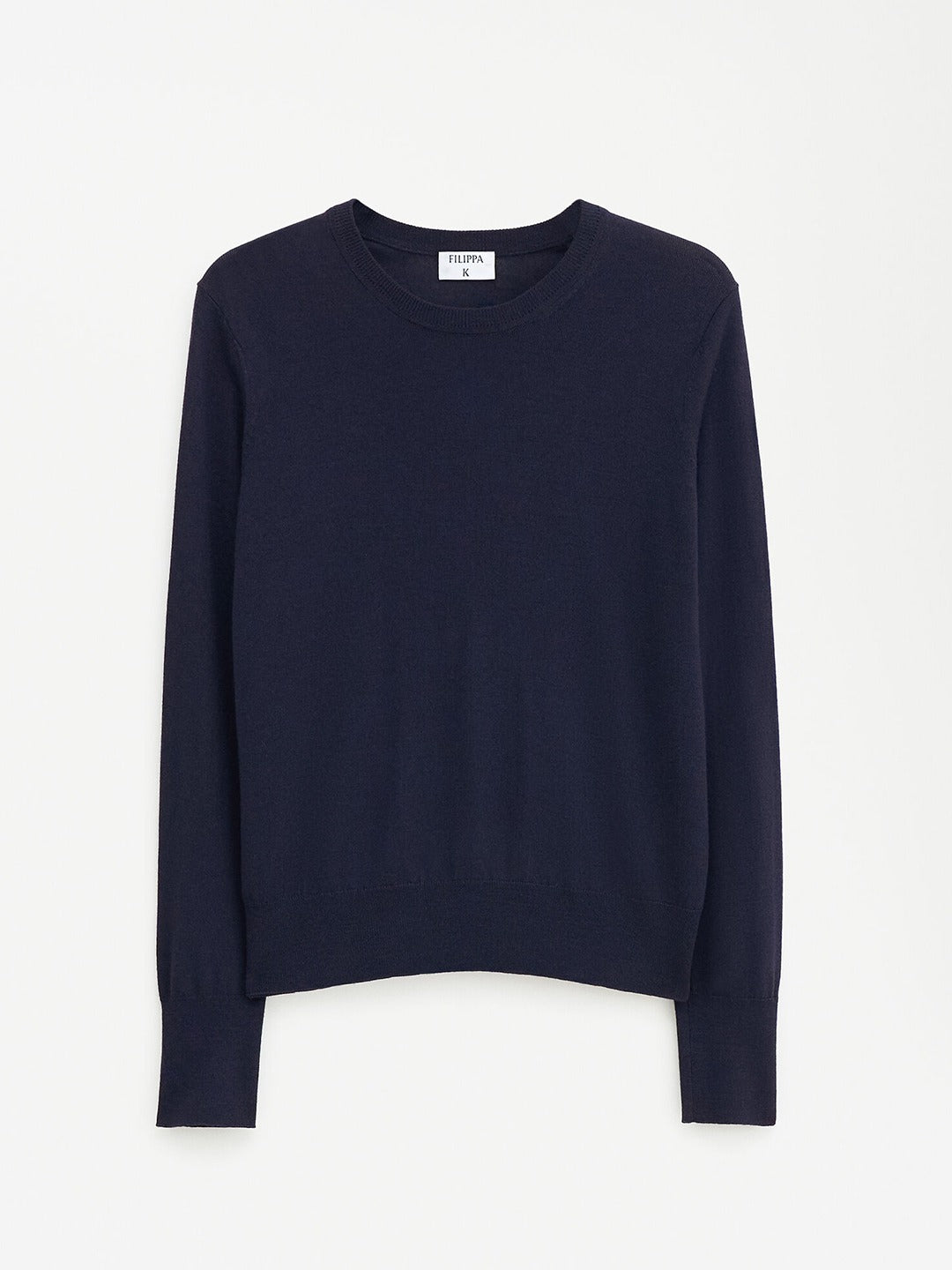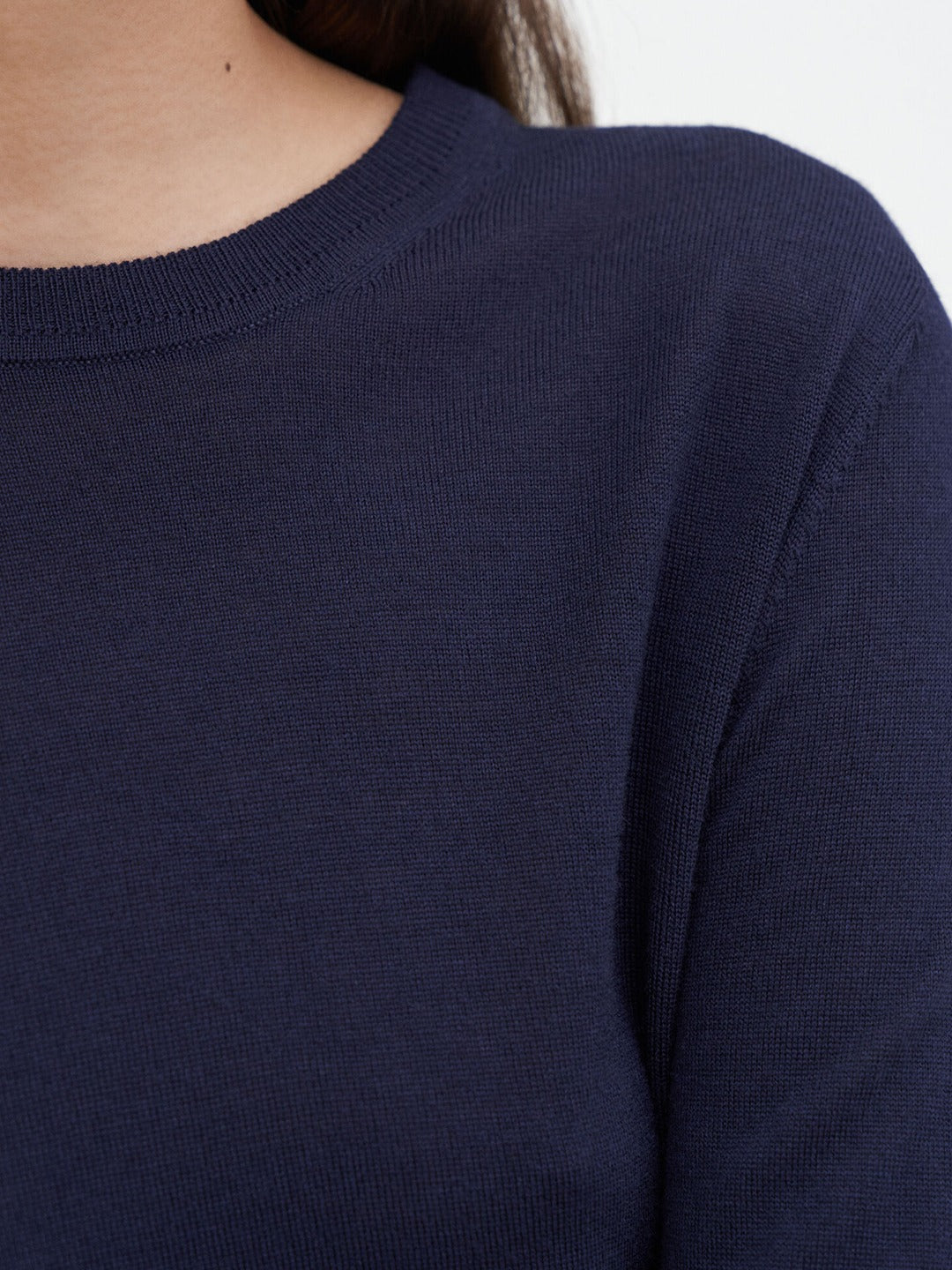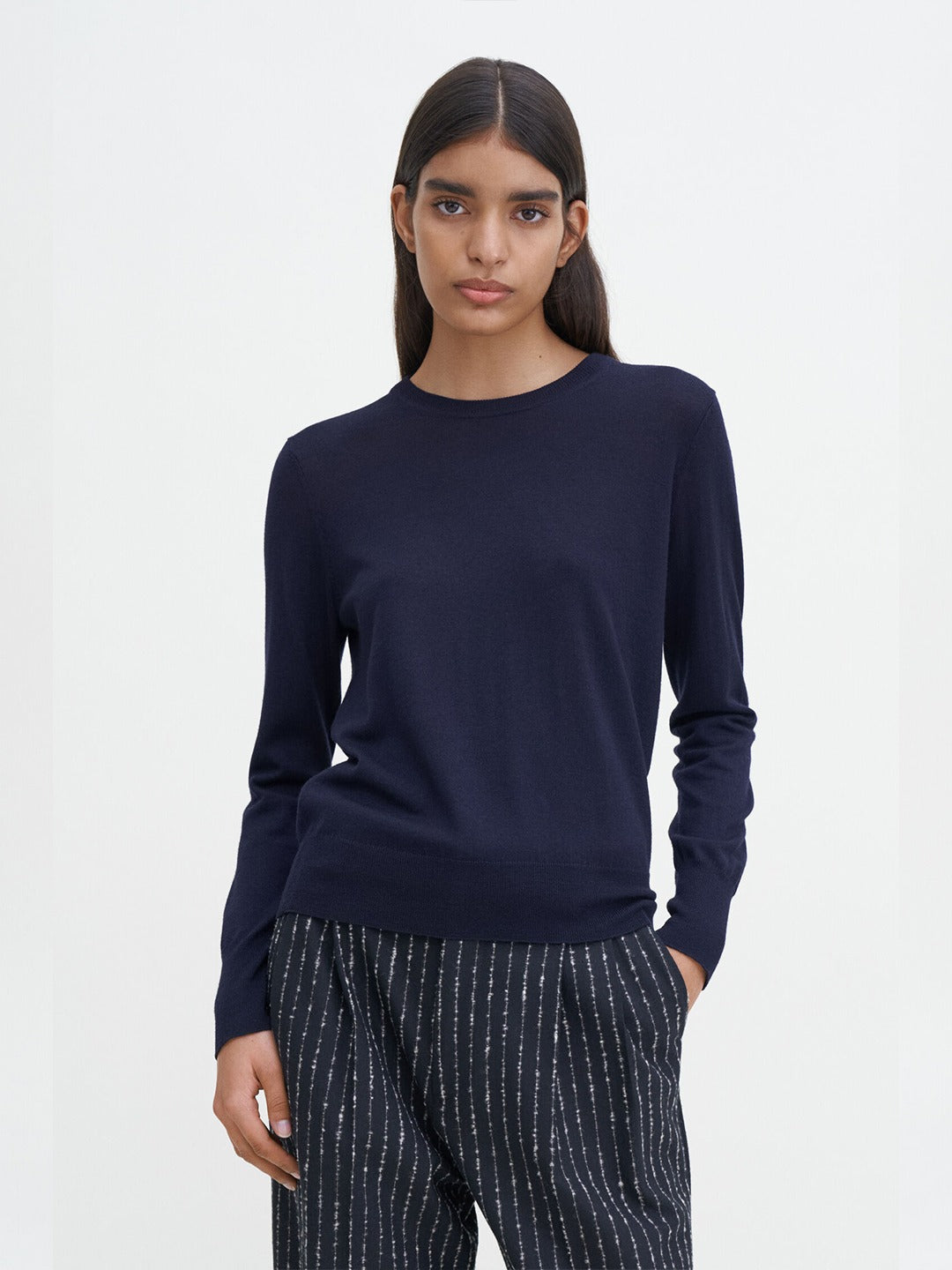 Slim fitting merino sweater. Round neck with wider ribbing at hem and cuffs, and thin rib at neckline.