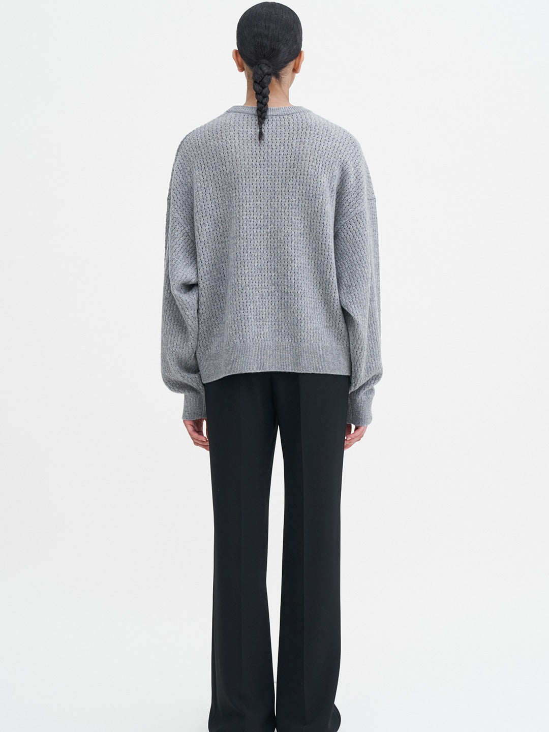 Mid weight crewneck sweater knitted in soft Italian wool and cashmere yarn. Pointelle pattern allover. Ribbing at neck, cuff and hem.