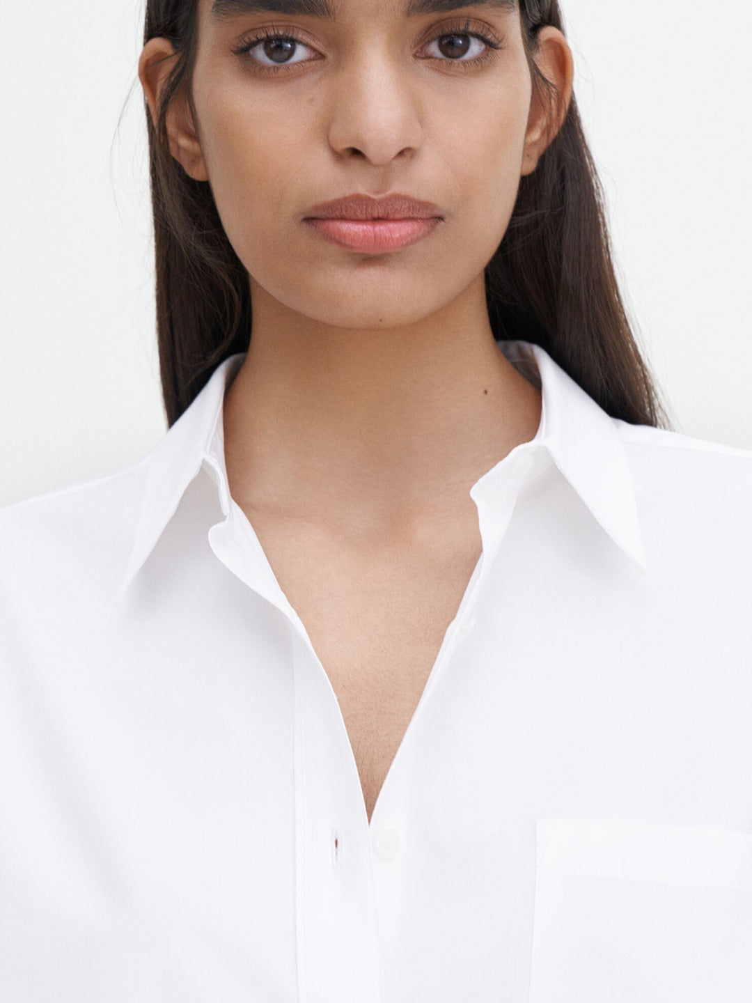 The Sammy Shirt has an oversized fit in grey blue organic cotton poplin with a soft finish. It's designed with a dropped shoulder and classic shirting details. Seen worn with Darcey Wool Trouser in Dark Grey Melange.