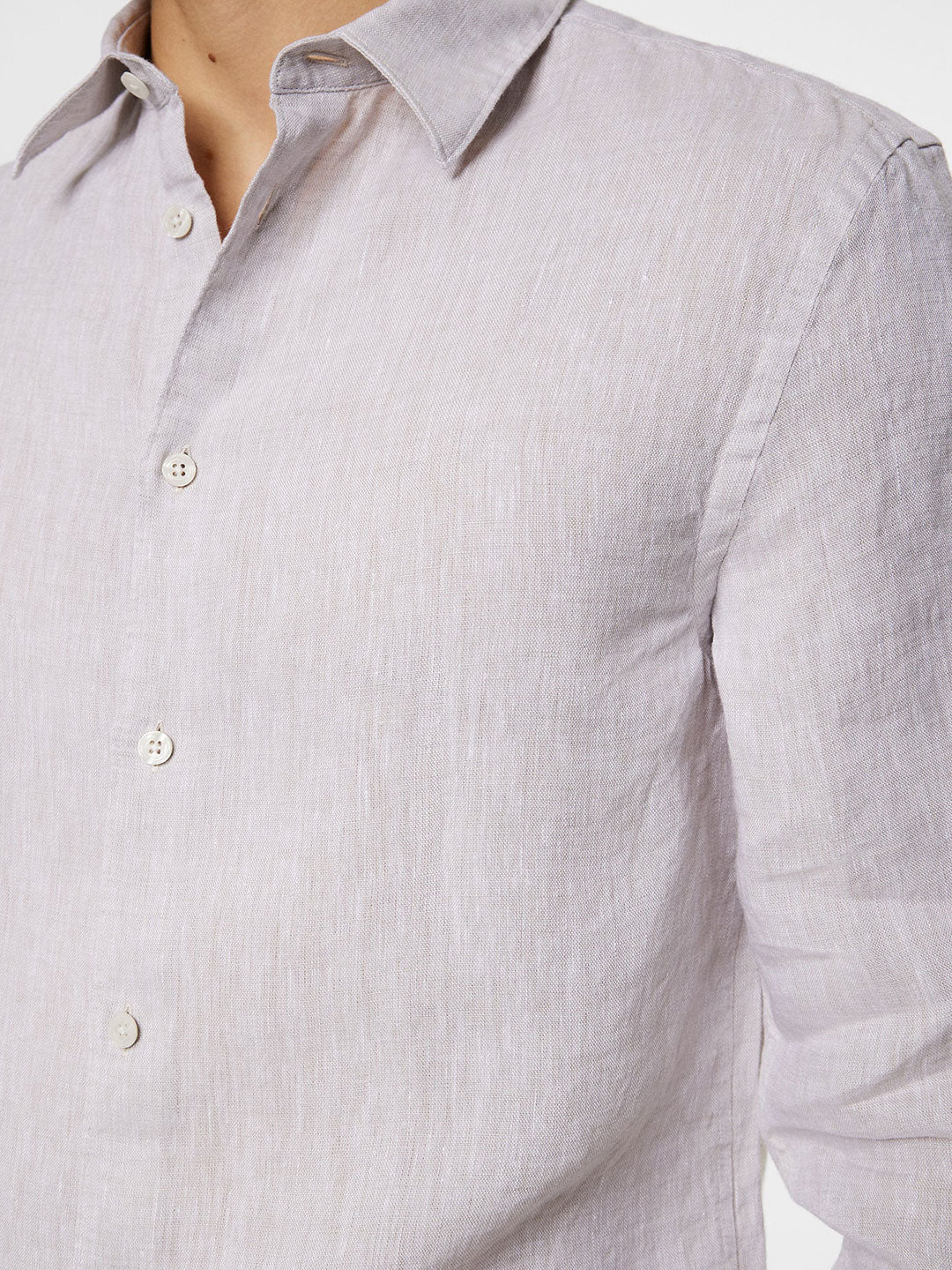 Slim fit Linen Melange Shirt, crafted from luxuriously soft linen. Powdered mother-of-pearl buttons detailed with the JL logo. Finished with a classic collar and understated tonal embroidery along the front hemline.