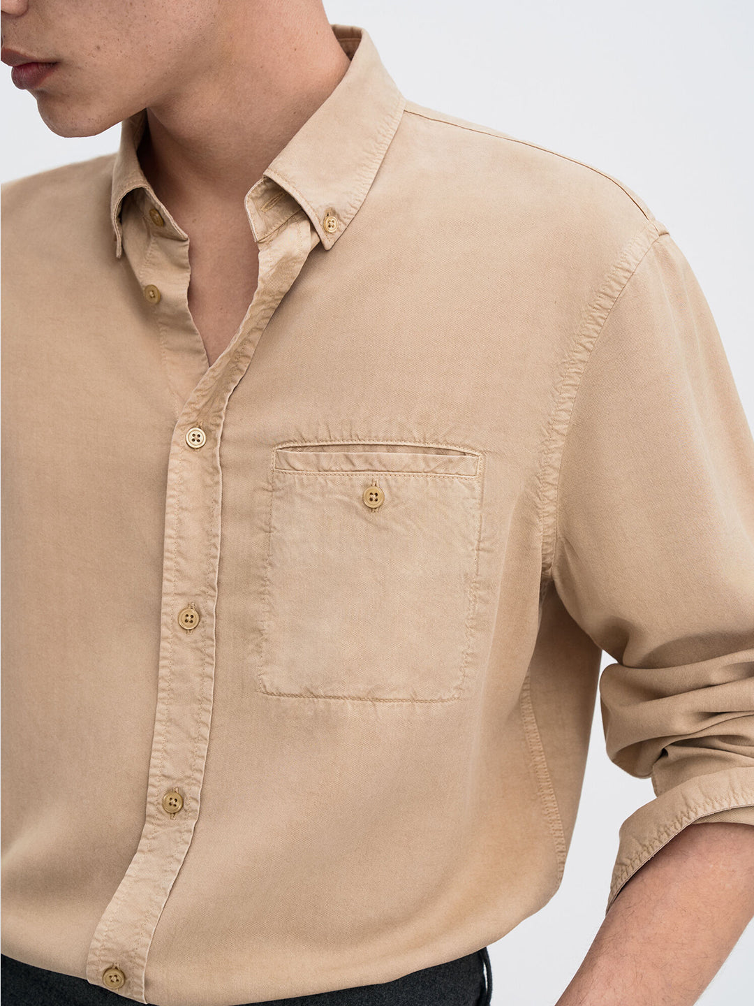 This shirt is made from soft and sustainable lyocell, giving it a relaxed fit. It has a front placket with topstitching and a button-down collar. The back yoke has a self-fabric loop, and there is a welt pocket at the chest that has a button closure.