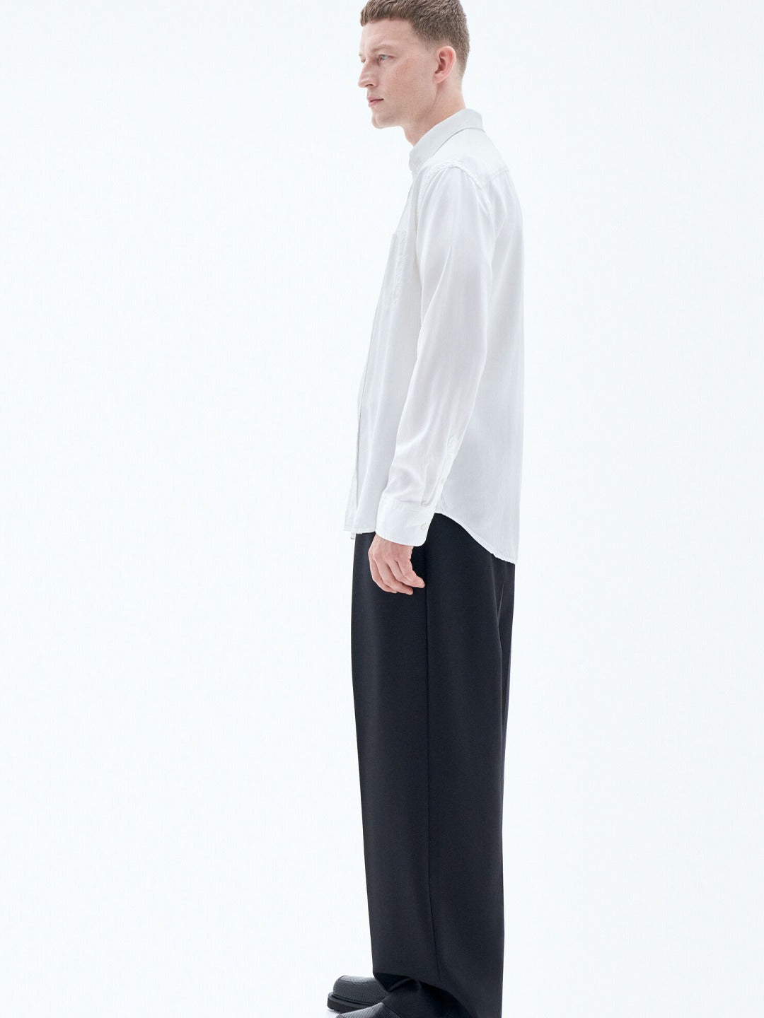 This shirt is made from soft and sustainable lyocell, giving it a relaxed fit. It has a front placket with top stitching and a button-down collar. The back yoke has a self-fabric loop, and there is a welt pocket at the chest that has a button closure.